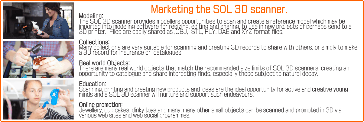 The SOL 3D scanner come to the market with variable scan distance, (object to laser), with accurate self calibration, upto 5 scan passes and able to complete the scan by creating a "waterproof" mesh, a 3D CAD file, able to be viewed and exported in one of several industry standard formats.