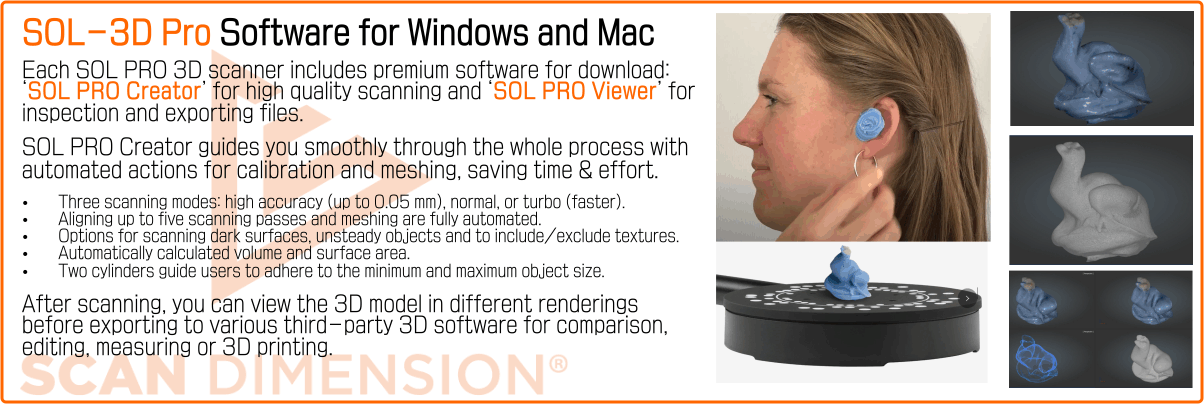 Download SOL PRO 3D scanner specialized software: ‘SOL PRO Creator’ for scanning and ‘SOL PRO Viewer’ for inspection and exporting of files.